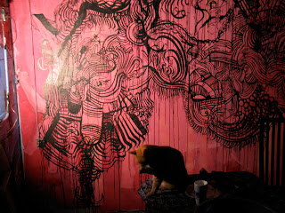 Well the first half of Sunday has been lazy, but not the second half. Here is a a few images of a mural inside of HazMat, a co-op living space in Downtown Oakland, my friend Ben Seevers and I did awhile back.